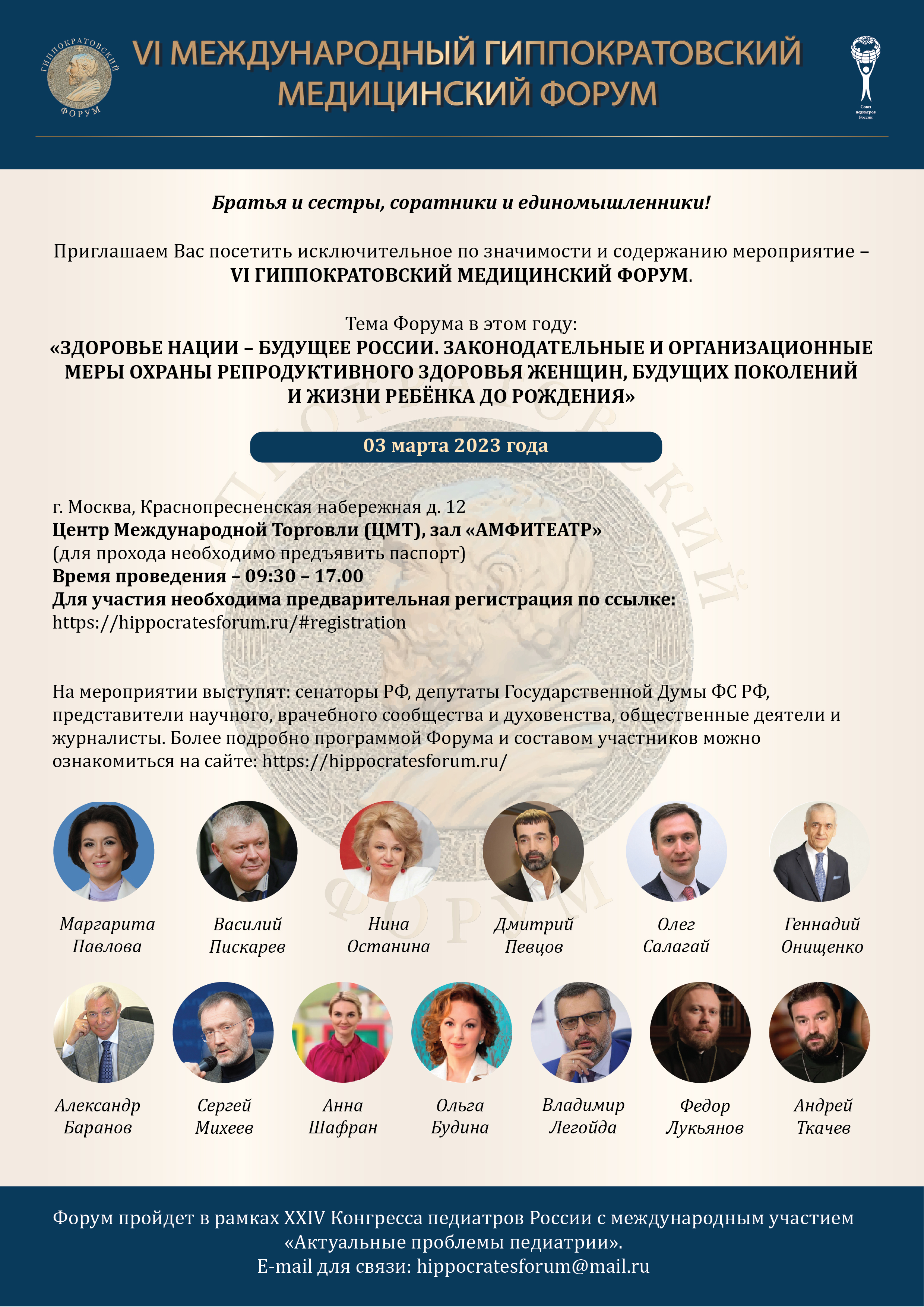 3 марта 2023 года в рамках XXIV Конгресса педиатров России состоится «VI Международный Гиппократовский Медицинский Форум» на тему: «Здоровье нации – будущее России, сообщается в пресс-релизе поступившем в редакцию Русской народной линии».