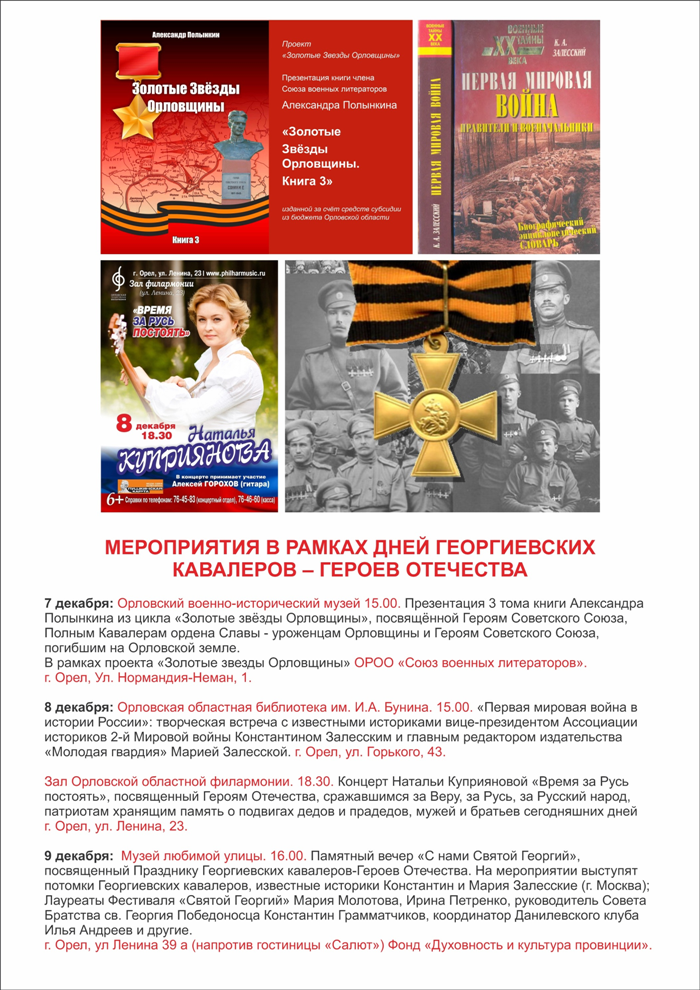 7 декабря: Орловский военно-исторический музей 15.00. Презентация 3 тома книги Александра Полынкина из цикла «Золотые звёзды Орловщины», посвящённой Героям Советского Союза, Полным Кавалерам ордена Славы - уроженцам Орловщины и Героям Советского Союза, погибшим на Орловской земле.