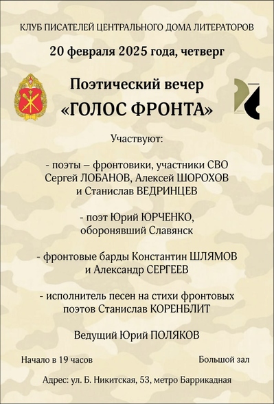 В четверг, 20 февраля, в Большом зале Клуба писателей Центрального дома литераторов состоится Поэтический вечер «ГОЛОС ФРОНТА», сообщается в информационном письме, поступившем в редакцию «Русской народной линии».