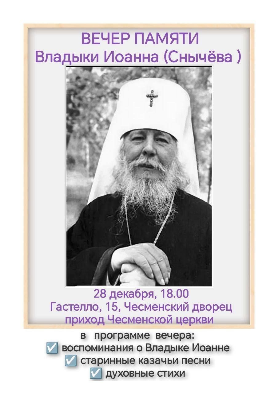 В воскресенье, 28 декабря, в Санкт-Петербурге в Чесменском дворце в 18:00 состоится вечер памяти митрополита Иоанна (Снычёва).
