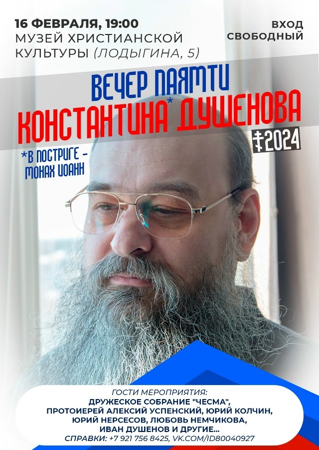 В понедельник, 16 февраля, в Санкт-Петербурге в Музее христианской культуры состоится вечер памяти Константина Душенова, сообщили «Русской народной линии» устроители памятного мероприятия.