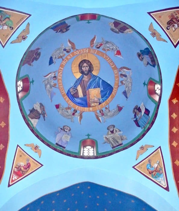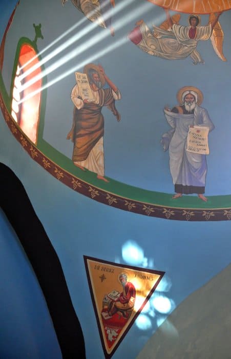 Из трапезной деревянная дверь с крестом ведет прямо в маленький храм. Помещение рассчитано всего на 25-30 человек, но оттого, что оно такое небольшое, как-то уютнее и приятнее, словно ты находишься у себя дома. Художница Анна из Йоханнесбурга расписала стены яркими фресками в наивном стиле. В алтарной апсиде - Богородица Оранта с грустным, задумчивым ликом; в куполе - Спаситель, чуть ниже, в барабане - апостолы, а в парусах - четыре Евангелиста; справа на стене Сошествие во ад и Вознесение Господне, слева - Преображение и над входной дверью - Успение Богородицы. Конечно, фрески не такого высокого качества, какие можно увидеть во многих храмах в России, но в них есть очарование наивности, какой-то особенный африканский дух. Нет, не этнические колорит или сюжеты, но что-то в цветах, в общем радостном ощущении от фресок.