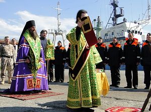 Перед отправкой корабля владыка совершил молебен о путешествующих. «Установление поклонных крестов на островах имеет глубокий смысл, - это знак того, что эти исконно русские земли, политые кровью наших отцов и дедов, мы не имеем никакого права просто так отдавать», – сказал, провожая экспедицию, епископ Петропавловский и Камчатский Артемий. – «Помощь Божия и покров Царицы Небесной да сопутствуют Вам на всем пути Вашего следования». С благословением путешественникам владыка передал руководителю экспедиции Е.М.Верещаге икону Спасителя.