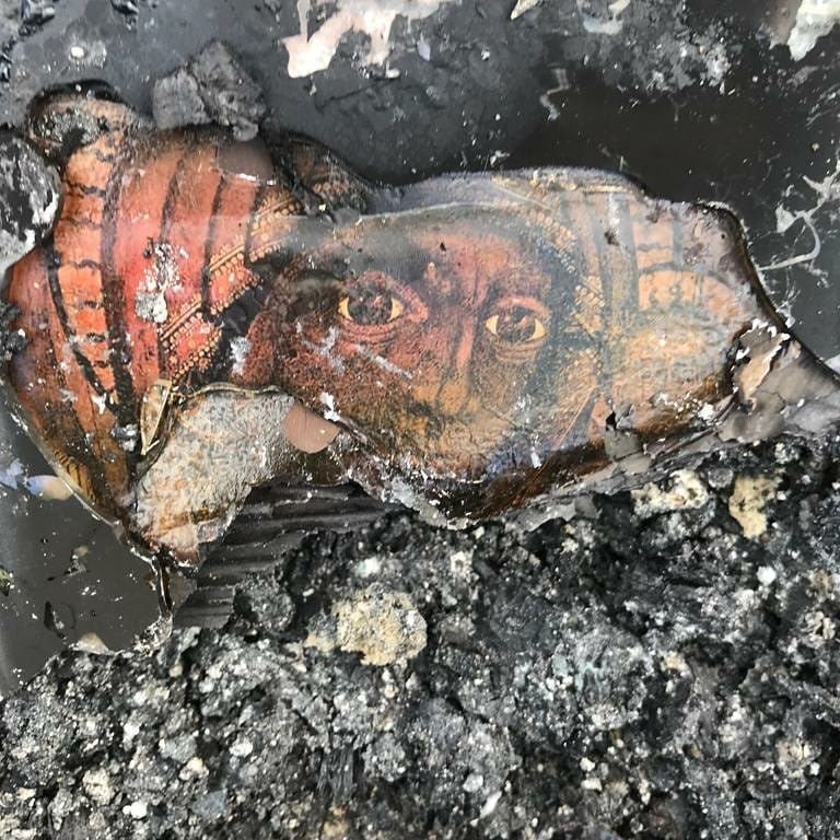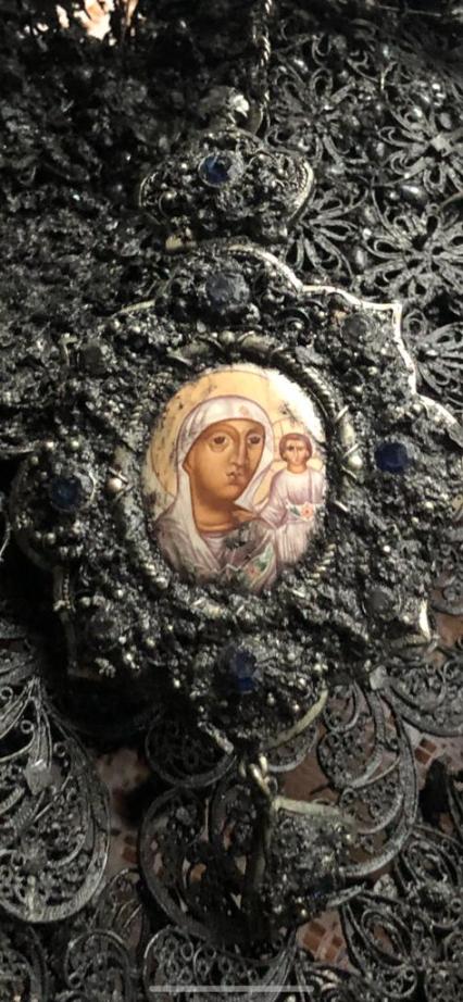 И вот недавно я узнал, что во время страшного пожара, который практически полностью уничтожил деревянную икону и основательно покорёжил ризу, панагия не пострадала. Хотя по всем законам физики должна была расплавиться. Но панагия уцелела! Как видим на фотографии, на ризе было две панагии, а уцелела только одна.