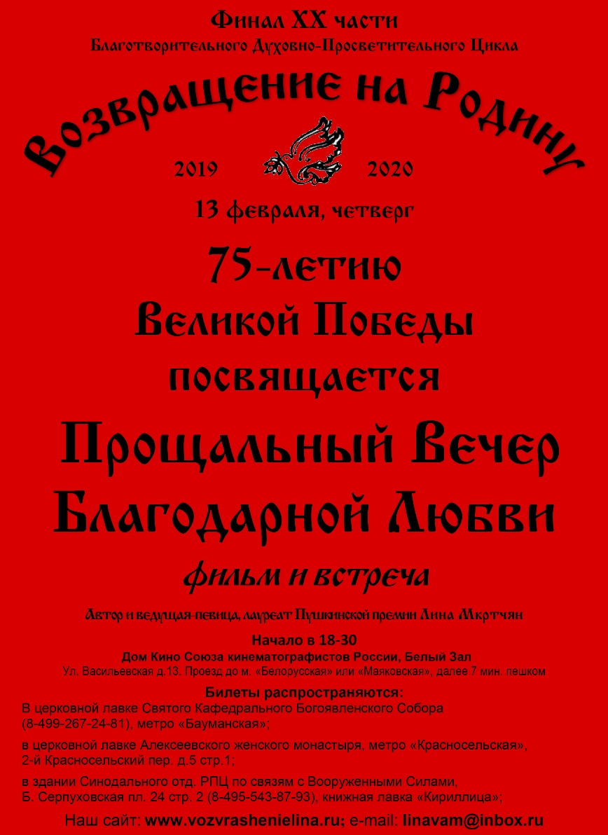 «Безценные наши читатели, слушатели, зрители, соучастники Цикла "Возвращение на Родину". Мы открываем XX юбилейную часть нашего Цикла. Она посвящена 75-летию Великой Победы и итогам Её завоеваний... Вся она перед вами и уже по названиям предстоящих вечеров Вы можете смело судить об актуальности и необходимости обсуждения этих горящих проблем нашей с Вами жизни, жизни наших детей, - говорится в обращении ведущей вечера певицы Лины Мкртчян, опубликованном на сайте "Возвращение на Родину". - Россия по-прежнему вопреки всему остается духовным колодцем челвоечества. Поэтому гибель Культуры грозит ей смертью. Нет ни одной области человеческого творчества, человеческой мысли. которую бы мы не затронули в этой части. Литература, поэзия, философия, живопись, все пластические виды искусства, театр, кинематограф и, конечно, музыка в контексте образования и просвещения, которые терпят самый большой урон и упадок. Мы приглашаем Вас семьями принять активное участие в обсуждении этих животрепещущих вопросов нашего настоящего и будущего.