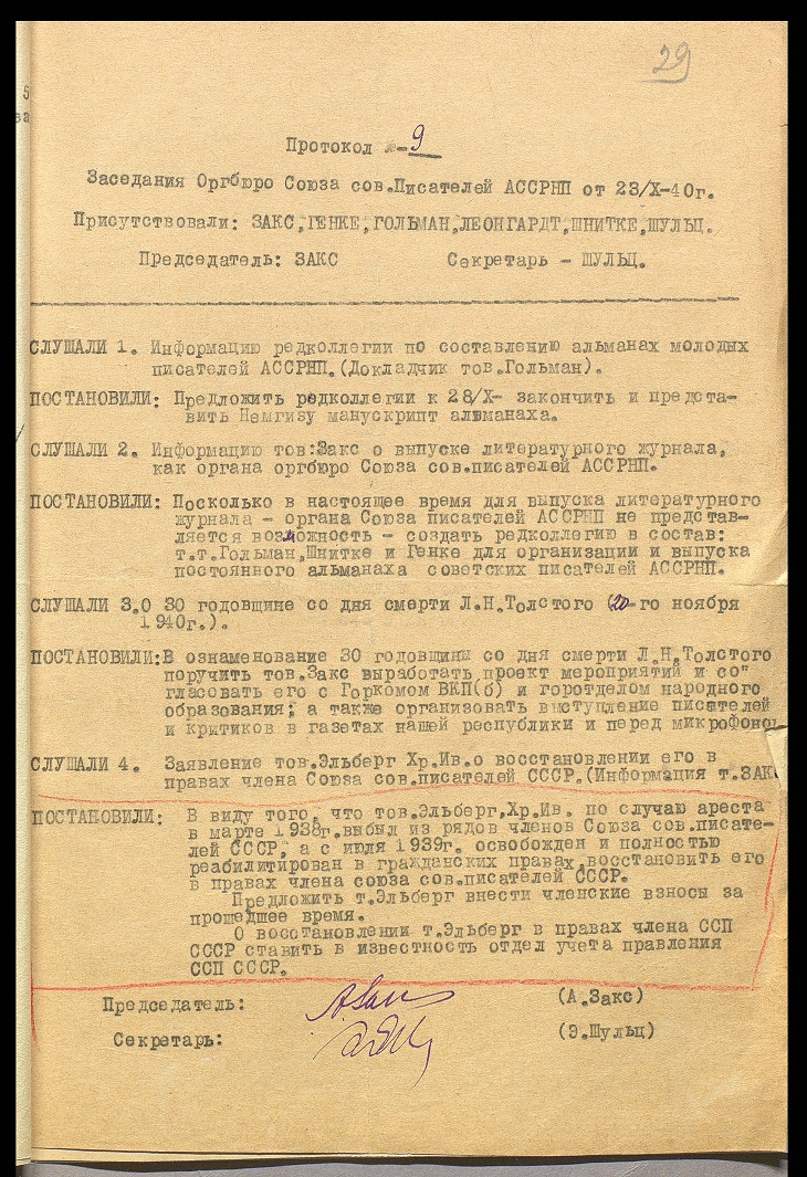 Протокол №9 от23.10.1940 О восстановлении писателя Эльберга в СП СССР