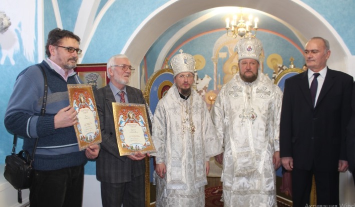 После того, как была совершена первая Божественная литургия, снова приятная неожиданность: епископ Вениамин награждает профессора Чароту и меня недостойного предивными Архиерейскими грамотами, которое вручаются за «труды во благо Борисовской епархии». Даём краткие интервью церковному телеканалу «Союз».