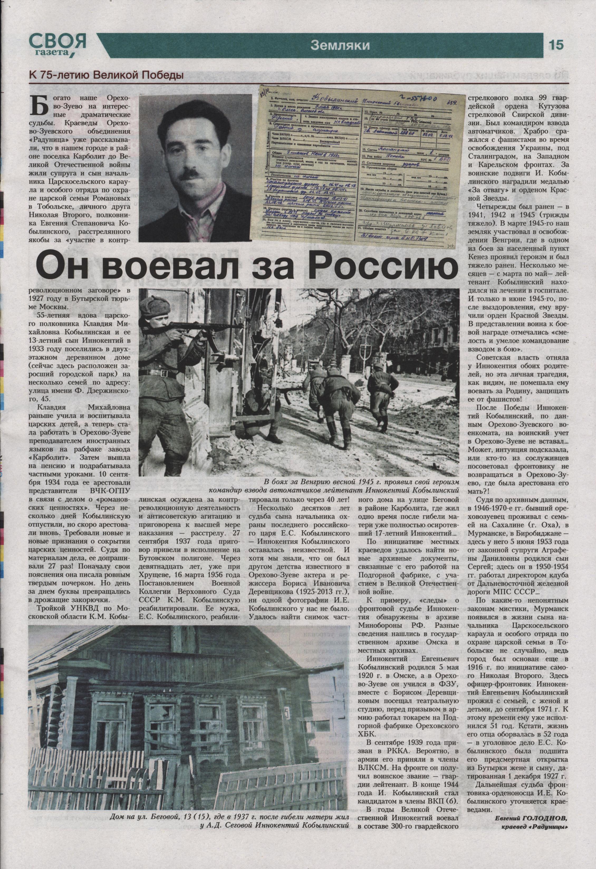 После Победы Иннокентий Кобылинский, по данным орехово-зуевского военкомата, на воинский учёт в Орехово-Зуеве не вставал… Может, интуиция подсказала, или кто-то из сослуживцев посоветовал фронтовику не возвращаться в Орехово-Зуево, где была арестована его мать?!