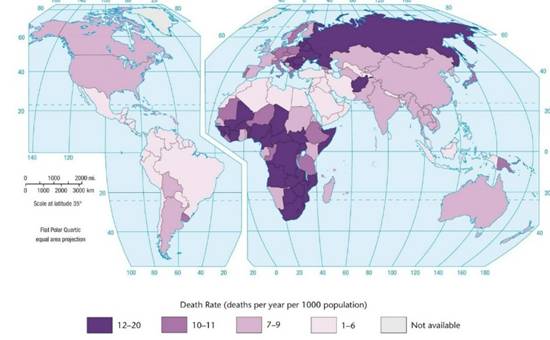 Начиная с 90-х годов и поныне по данным международной статистики демографическая ситуация в России, как это видно из карты мира, находится на уровне слаборазвитых вымирающих африканских стран (тёмным цветом показан высокий уровень смертности - количество смертей на 1000 человек в год).