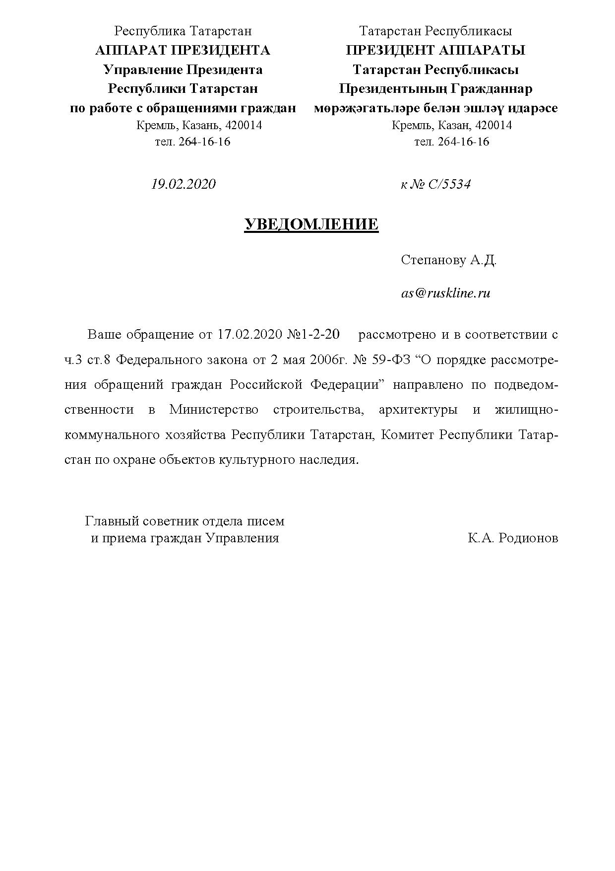 И, вот, поступила первая реакция на обращение РС – из Республики Татарстан, правда, не от главы региона, к которому обращались общественники, а из его аппарата. Казанские чиновники уведомили, что письмо «Русского Собрания» перенаправлено почему-то в ... региональное Министерство строительства, архитектуры и ЖКХ. Впрочем, странности начались уже тогда, когда письмо рассматривалось Управлением по работе с обращениями граждан, хотя обращался не гражданин, а международная общественная организация. На фоне всего этого и вовсе мелочью выглядит отсутствие под письмом подписи должностного лица…