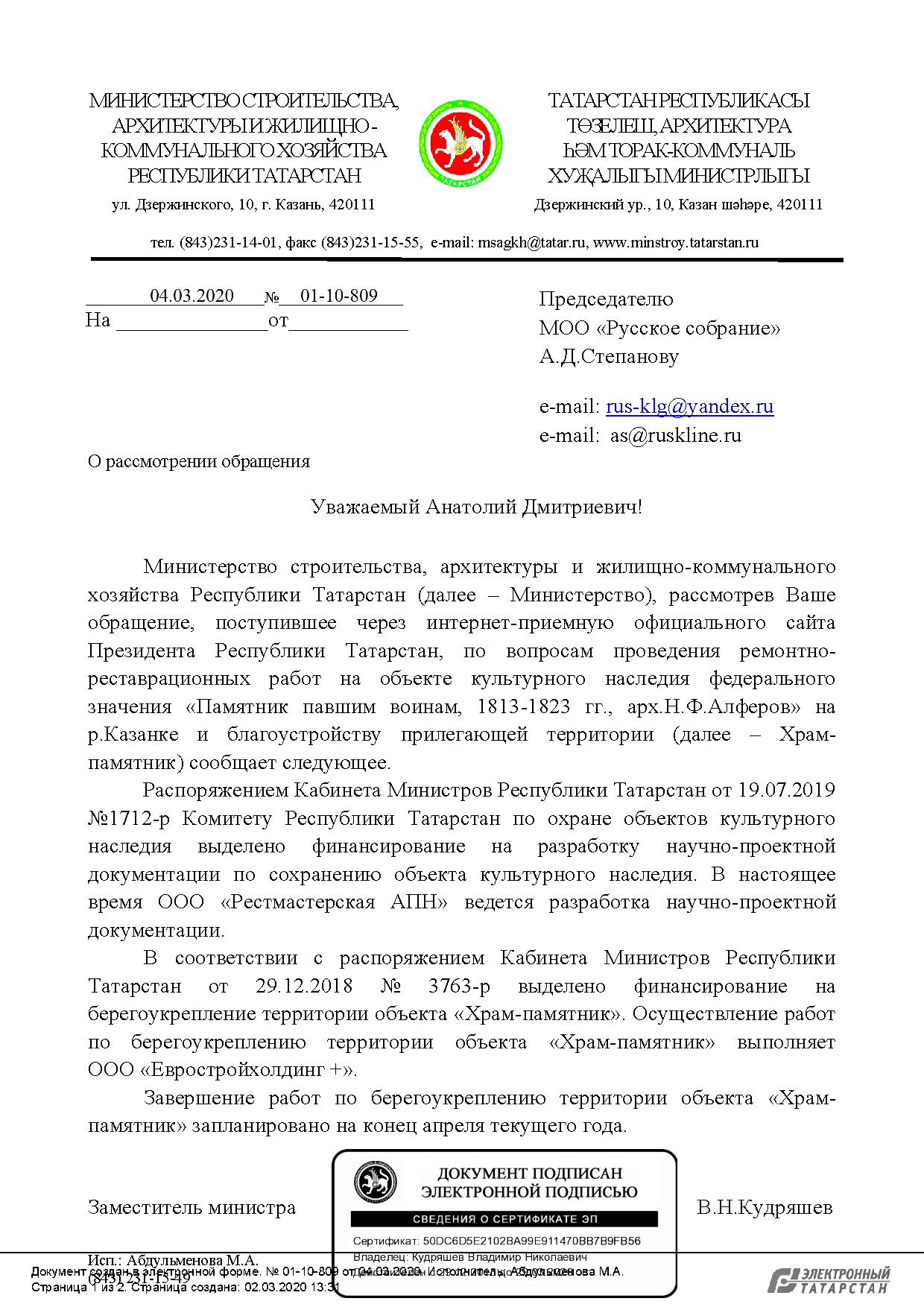 Далее в письме сообщается, что «в соответствии с распоряжением Кабинета Министров Республики Татарстан от 29.12.2018 № 3763-р выделено финансирование на берегоукрепление территории объекта «Храм-памятник». Осуществление работ по берегоукреплению территории объекта «Храм-памятник» выполняет ООО «Евростройхолдинг +». Завершение работ по берегоукреплению территории объекта «Храм-памятник» запланировано на конец апреля текущего года».