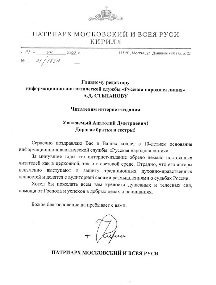 Главный редактор Анатолий Дмитриевич Степанов и сотрудники «Русской народной линии» от души благодарят Его Святейшество за это внимание, поздравительное слово и доброе напутствие.