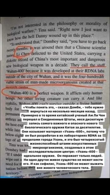 Наименование вируса, присутствующего в тексте — «Ухань-400» (Wuhan-400). А согласно скану страниц с англоязычным текстом, происходит это всё в 2020 году.