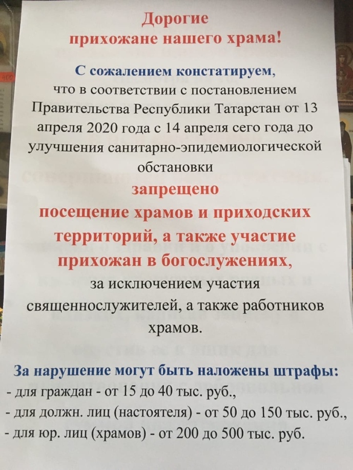 Президент России Владимир Путин поручил главам регионов вести свою работу исходя из конкретной ситуации в каждом регионе. На 14.04.2020 в Республике Татарстан зарегистрировано всего 107 случаев заболевания коронавирусом, смертельных исходов – ни одного. Каковы основания при таком количестве заражённых с нулевой смертностью прибегать к подобным репрессиям, тем более в храмах, где бывают люди с повышенной личной ответственностью перед Богом за всё?