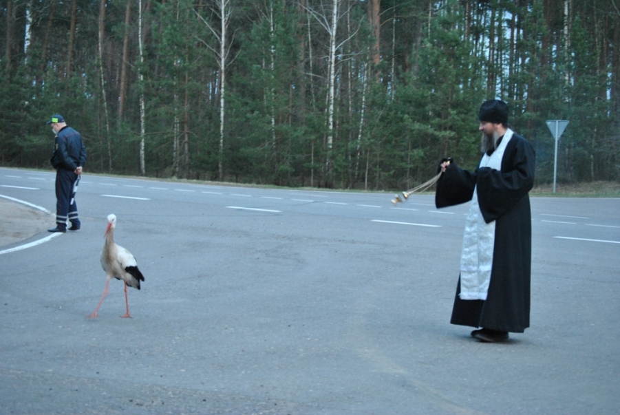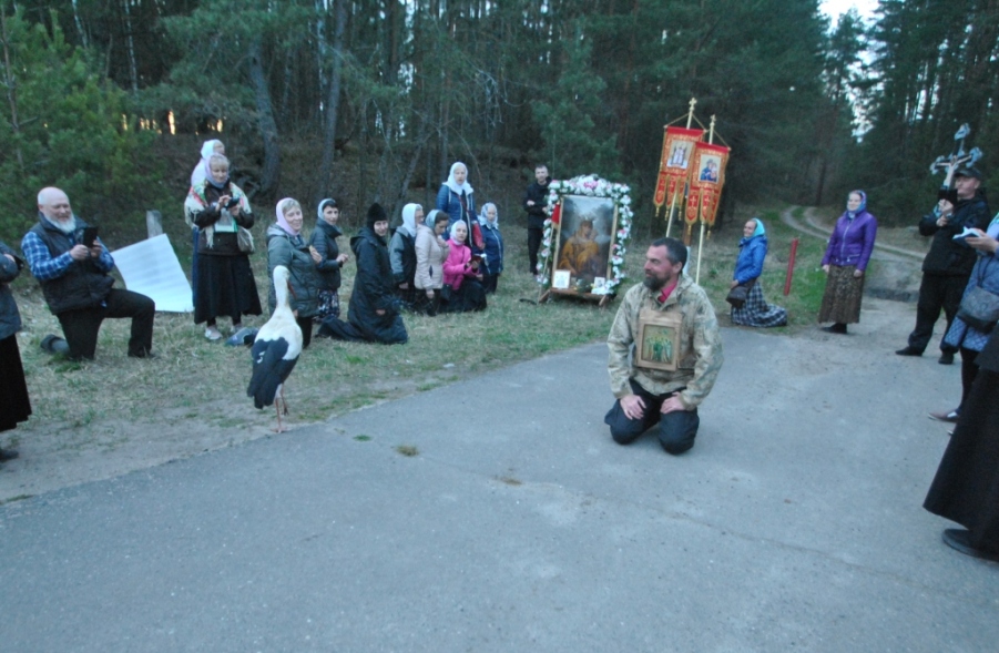 «Этот Аист шёл Крестным ходом рядом с нами в полуметре, по обочине почти 12 км. Если чуть отставал, так как мы шли в чётком ритме, то он подлетал до хоругвей и затем снова шёл! Все наши попытки уговорить его отдохнуть или с заходом солнца вернуться, были тщетными. Он шёл и шёл, не боясь ни людей, ни проезжающих машин и фур. Так продолжалось более 4-х часов. Единственная наша тревога за его жизнь была, когда он перелетал на сторону проезжей части. Сопровождающая нас машина ГАИ несколько раз задерживала движение транспорта, чтобы машины случайно не сбили "крылатого подвижника"», — поделился впечатлением один из участников Крестного хода.