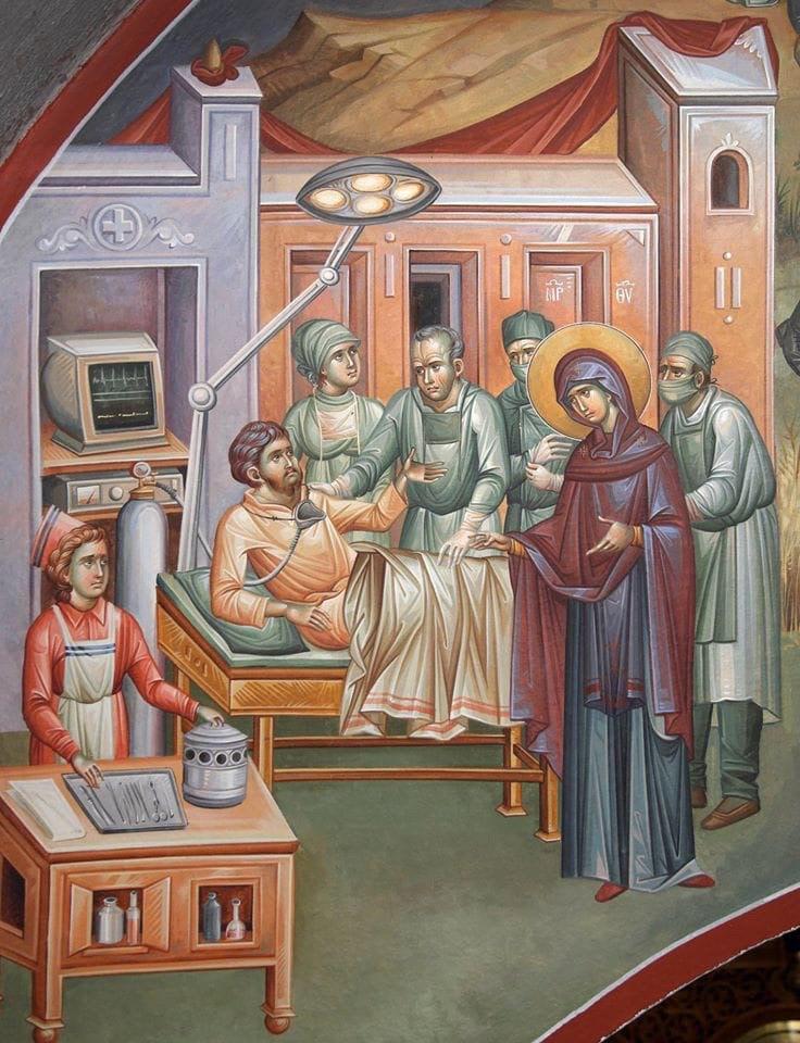 На фото: изображение «Божия Матерь у постели больного коронавирусом» из Ватопедского монастыря на Афоне.