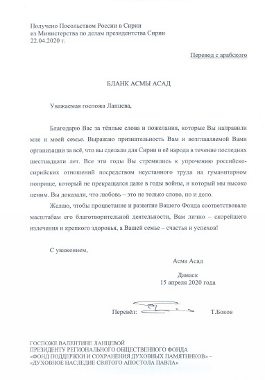 Ланцева в этом не ошибается. И все именно так. Подтверждением этого стало полученное ею через Посольство Российской Федерации в Сирийской Арабской Республике Письмо от госпожи Асмы Асад, супруги Президента Сирии. Это письмо из-за сложности нынешнего времени из Администрации госпожи АсмыАсад принесли в наше Посольство в Дамаске накануне Пасхи Господней. Второй Советник Посольства России в Сирии связался с В.А. Ланцевой и сообщил о письме. Получив разрешение, наши сотрудники Посольства его вскрыли, перевели с арабского на русский и переслали в электронном виде.