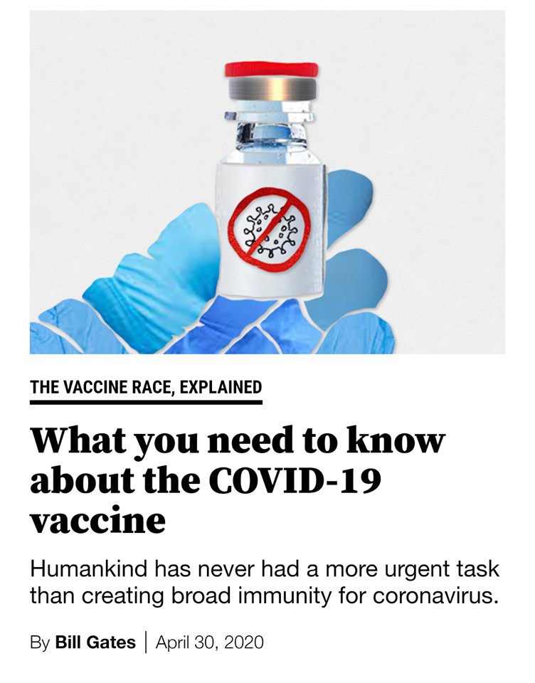 30 апреля, в день выхода цитируемой статьи в «Нью-Йорк Таймс», мистер Гейтс писал на своём интернет сайте: «Один из вопросов, который мне задают чаще всего в эти дни: когда мир сможет вернуться к тому, что было в декабре до пандемии коронавируса. Мой ответ всегда один и тот же: когда почти каждый человек на планете будет вакцинирован против коронавируса. Но это вряд ли произойдёт в ближайшее время. Нам понадобится чудодейственное лечение, которое было бы по крайней мере на 95% эффективным, чтобы остановить вспышку болезни. Нам нужно сделать не менее 7 миллиардов доз этой вакцины, а потом доставить их во все уголки мира. Нам нужно, чтобы всё это произошло как можно быстрее. Наш фонд является крупнейшим спонсором создания вакцин в мире, и усилия по созданию вакцины от Covid-19 затмевают всё, над чем мы когда-либо работали раньше, - сообщает Гейтс. - Уже сейчас мы строим различные виды вакцинальных заводов. Это будет стоить миллиарды долларов! Наш фонд в настоящее время работает с CEPI (Коалиция за инновации в области обеспечения готовности к эпидемиям), ВОЗ и правительствами многих стран, чтобы найти финансирование.