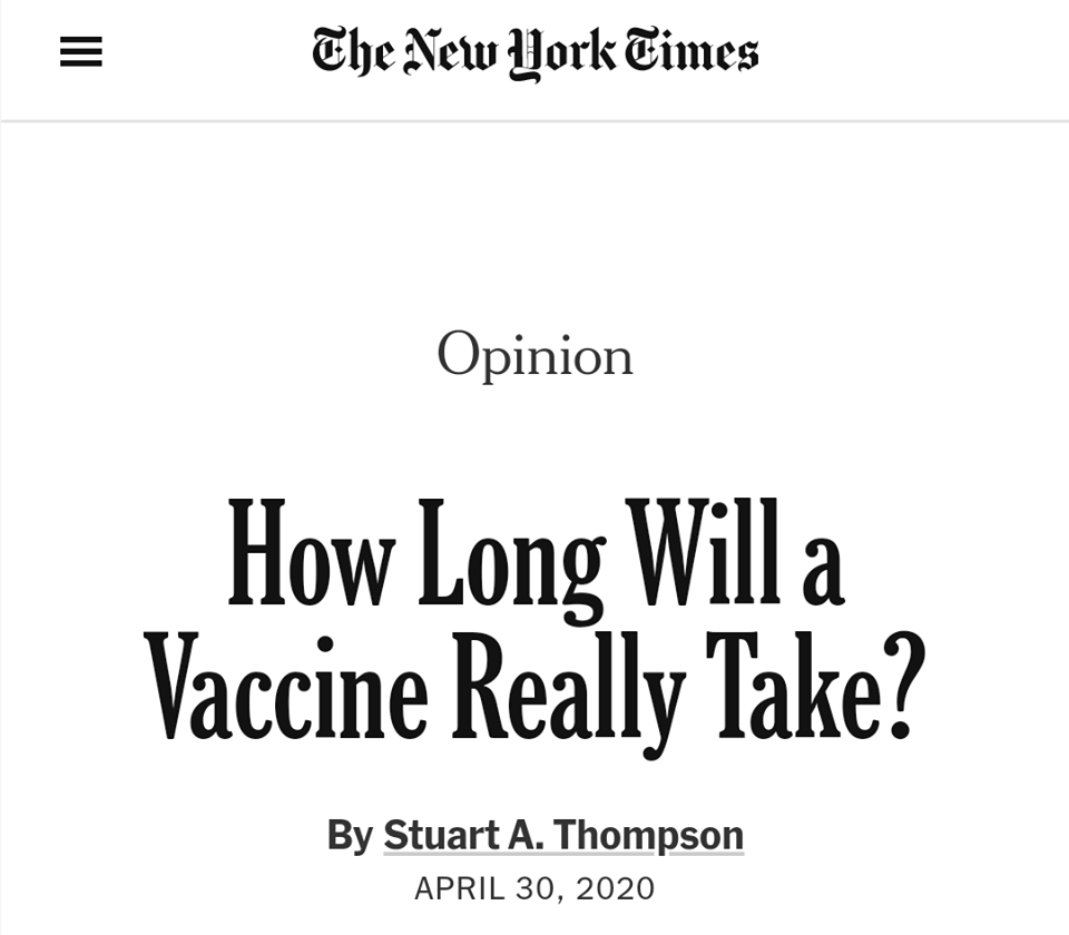 30 апреля в «Нью-Йорк Таймс» вышел обширный материал Стюарта А. Томпсона под названием «Как долго нам ждать вакцину», в котором сообщалось, что вакцина хоть и является лучшим оружием против коронавируса, однако в ближайшее время исправить ситуацию всё-таки не сможет. Официальные лица, такие как доктор Энтони С. Фаучи, главный эксперт по инфекционным заболеваниям в целевой группе по коронавирусу администрации Трампа, оценивают, что вакцина может быть создана, при самых быстрых темпах, лишь только через 12-18 месяцев. Мрачная правда, стоящая за этим «радужным» прогнозом, заключается в том, что в ближайшее время вакцины не будет – сообщает автор, поскольку рекорд по разработке совершенно новой вакцины составляет ни много ни мало четыре года, а это больше, чем может пережить общество или экономика в режиме «социальной дистанции».