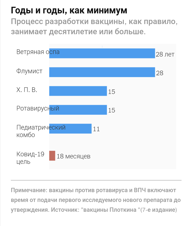 Таким образом, по подсчётам экспертов «Нью-Йорк Таймс» на весь процесс связанный с вакцинацией - от создания вакцины, прохождения тестирования и завершающего этапа юридическогооформления - при самом оптимистическом раскладе уйдет около трех лет. А что, если это займёт больше времени, чем предсказывают оптимисты? Да за подобный срок способно вымереть пожалуй всё человечество без остатка (если этот вирус, конечно, так страшен, как его малюют).