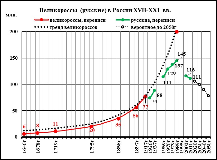 Комплексное влияние этих факторов можно показать динамикой численности великороссов по переписям Царской России – красный график диаграммы. Пунктирный график диаграммы в 1897-1917 годах и далее показывает величину ежегодного прироста 0,15%, по которой Дмитрий Иванович Менделеев рассчитал численность России 2000 года – 594 млн. чел.