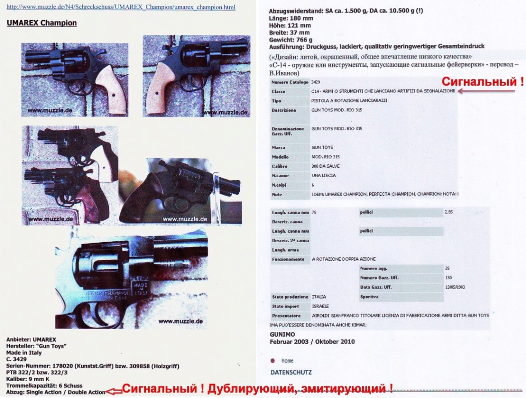 1. Я не имел инкриминируемого мне оружия – газовый револьвер, - при себе, поскольку найденный в моей комнате сломанный и абсолютно не функционирующий стартовый револьвер марки «UMAREX MOD. CHAMPION № 244236» не является огнестрельным оружием по квалификации самой фирмы изготовителя данного стартового револьвера. Суду было представлено факсимиле соответствующей справки-спецификации изготовителя, где указывается однозначно - данный револьвер марки «UMAREX MOD. CHAMPION» является сигнальным. То есть - ни газовым, ни каким-либо ещё. (Прилагаю факсимиле данного документа предприятия изготовителя револьвер марки «UMAREX MOD. CHAMPION», а также экспертное фото двух шумовых патронов с маркировкой, которые были в барабане данного сломанного револьвера);