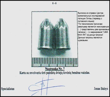 3. Ни один из экспертов, исследовавших данный стартовый револьвер, не назвал его действующим, т.е. готовым без каких-либо дополнительных усилий произвести выстрел шумовым патроном, поскольку «спусковой механизм и детали в нём не взаимодействовали», «были не настоящими». Тем не менее, суд принял, как правдивое, заведомо абсолютно ложное заявление свидетеля-эксперта Маргариса Даунораса, руководителя группы, проводившей обыск на моей квартире 18 декабря 2018 года (в связи с абсолютно абсурдным обвинением Генеральной прокуратурой Литвы меня в шпионаже), когда он на заседании суда по данному делу 30 января 2020 года нагло врал под присягой о том, что нашёл у меня газовый револьвер с особо опасными для здоровья газовыми патронами с маркировкой «CS» на гильзах, в то время как следствием было установлено, что два патрона в барабане найденного у меня 18 декабря 2018 года при обыску в платяном шкафу сломанного стартового револьвера марки «UMAREX MOD. CHAMPION» были шумовыми, а не газовыми (других каких либо огнестрельных патронов у меня не было найдено) – данный суд имеет фото этих шумовых патронов с их маркировкой, предоставленных следствием. (Представляю справку выписку данных показаний экспертов по оружию суду);