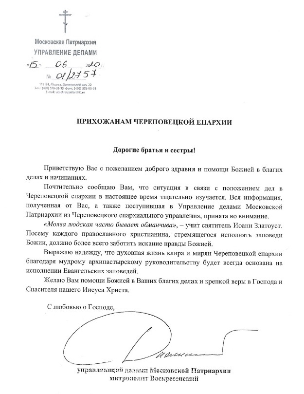 Владыка заверяет череповецкую паству, что «ситуация в связи с положением дел в Череповецкой епархии в настоящее время тщательно изучается. Вся информация, полученная от Вас, а также поступившая в Управление делами Московской Патриархии из Череповецкого епархиального управления, принята во внимание».