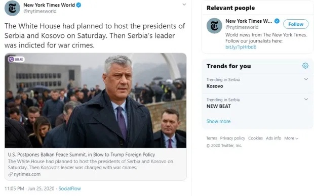 В сербоцентричном и американофобском сегменте русских патриотов сегодня одной из центральных новостей стало сообщение о том, что американская газета «New York Times» в своем твиттере перепутала президента Сербии Александра Вучича с лидером т.н. «Республики Косова» Хашимом Тачи. Журналисты написали, будто встреча Вучича и Тачи в Вашингтоне отменена из-за того, что «лидер Сербии обвинен в военных преступлениях». Несмотря на лавину комментариев исправление было внесено только через десять часов.