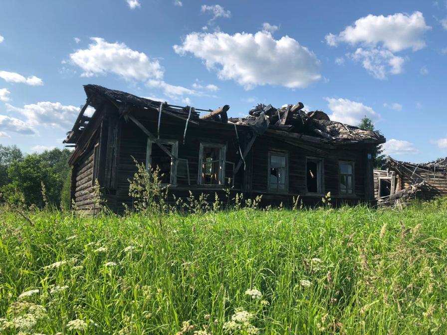 Село Пинагощи. Сельская церковь в честь Покрова (30-е годы 19-го века) с дороги похожа на шлем древнерусского воина. Покрыт железом купол храма, а алтарная часть полностью в железном чехле – иначе спасти её было невозможно. Обильные дожди за последние недели даром не прошли – в трапезной части обнаружили новые обрушения. Очевидно, что над храмом по-прежнему нависает угроза разрушения. Все обращения о помощи – как будто в пустоту.