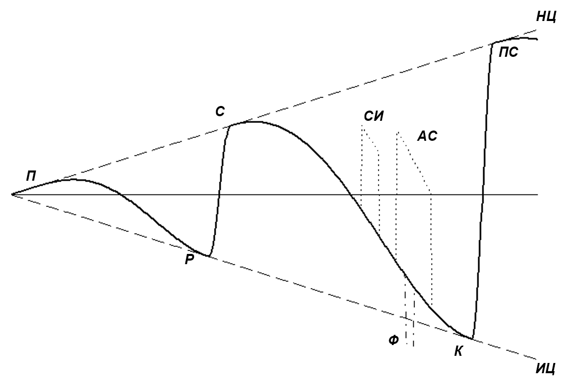 Пребывание на пике – это неустойчивое состояние, требующее постоянной духовной мобилизации членов общества, определенной «возгонки» (пассионарности). По мере «остывания» (что чаще всего связано с обретением относительного благополучия) в обществе растет энтропия, вызываемая усилением гедонистических и эгоистических потребностей. Покатость графика на участках П-Р и С-К имеет ясное духовное объяснение: «Подобно тому как сидящие на покатости сползают вниз при всяком движении, так и здесь естественное расположение – изгнать Бога, избавиться от Бога, чтобы быть самим собою» (Флоренский П.А. Культурно-историческое место… – С. 453).