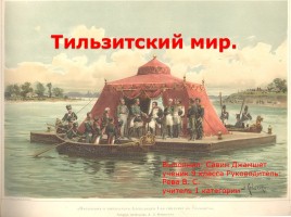 Отрывок из романа Л.Толстого «Война и мир» о Тильзитском мире: «Борис (Друбецкой) в числе немногих был на Немане в день свидания императоров. Он видел плоты с вензелями, проезд Наполеона по тому берегу мимо французской гвардии, видел задумчивое лицо императора Александра в то время, как он молча сидел в корчме на берегу Немана, ожидая прибытия Наполеона. Видел, как оба императора сели в лодки, и как Наполеон, приставши прежде к плоту, быстрыми шагами пошел вперед и, встречая Александра, подал ему руку, и как оба скрылись в павильоне».