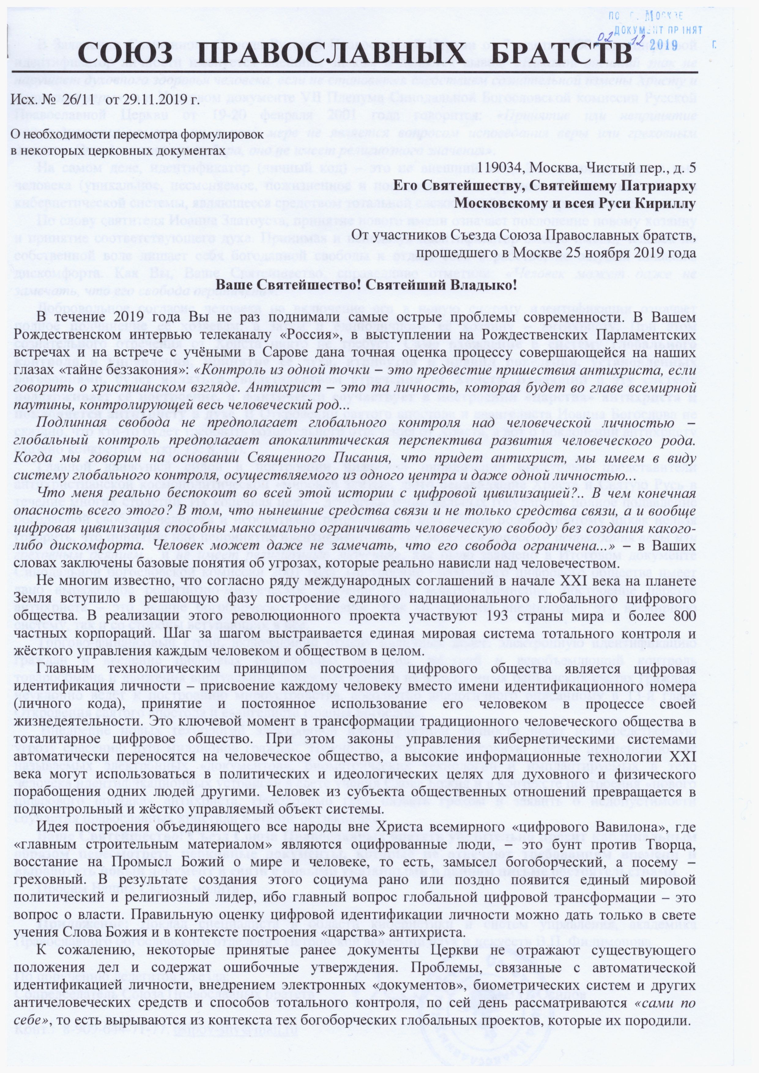 2 декабря 2019 года в канцелярию Московской Патриархии директором издательства «Благословение» Юрием Григорьевичем Самусенко было передано под расписку Обращение Съезда Союза Православных Братств к Святейшему Патриарху Московскому и всея Руси Кириллу «О необходимости пересмотра формулировок в некоторых церковных документах», а 6 декабря 2019 года там же был получен входящий № 11790.