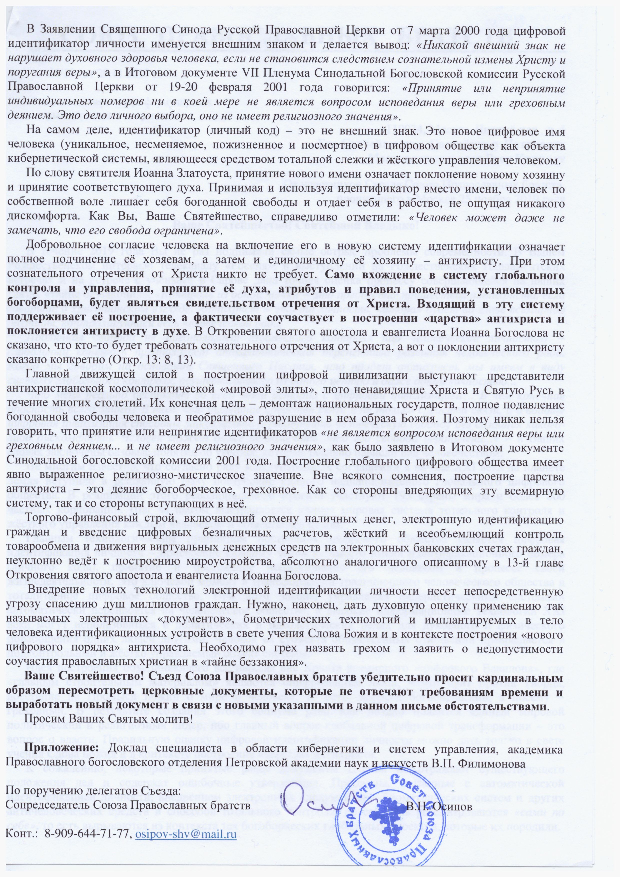Приложение: Сканы Обращения Съезда Союза Православных Братств к Святейшему Патриарху Московскому и всея Руси Кириллу от 29 ноября 2019 года со штампом канцелярии Московской Патриархии, подписанные сопредседателем Союза Православных Братств Владимиром Николаевичем Осиповым.