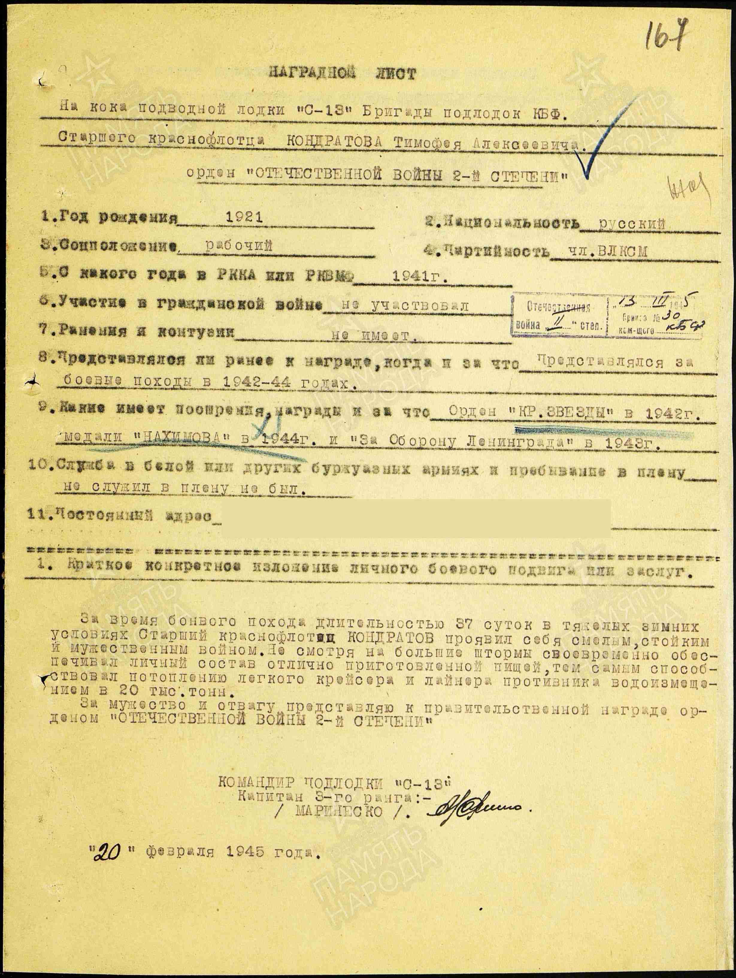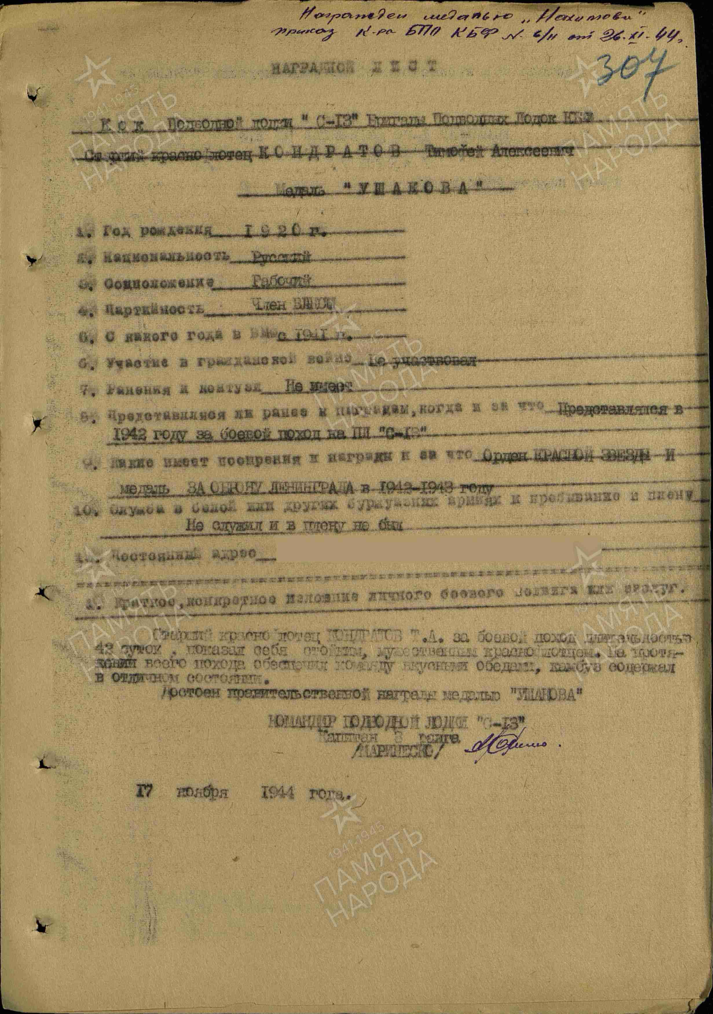 Вскоре после возвращения из него, 26 ноября, Тимофея Кондратова наградили медалью Нахимова (в представлении к награде командир Маринеско первоначально указал медаль Ушакова). На протяжении всего похода кок обеспечивал команду, как всегда, вкусными обедами, а камбуз содержал в отличном состоянии. Заметим, по техническим данным автономность данного типа лодок составляла всего 30 суток. А в случае с ПЛ С-13 на 13 суток больше!