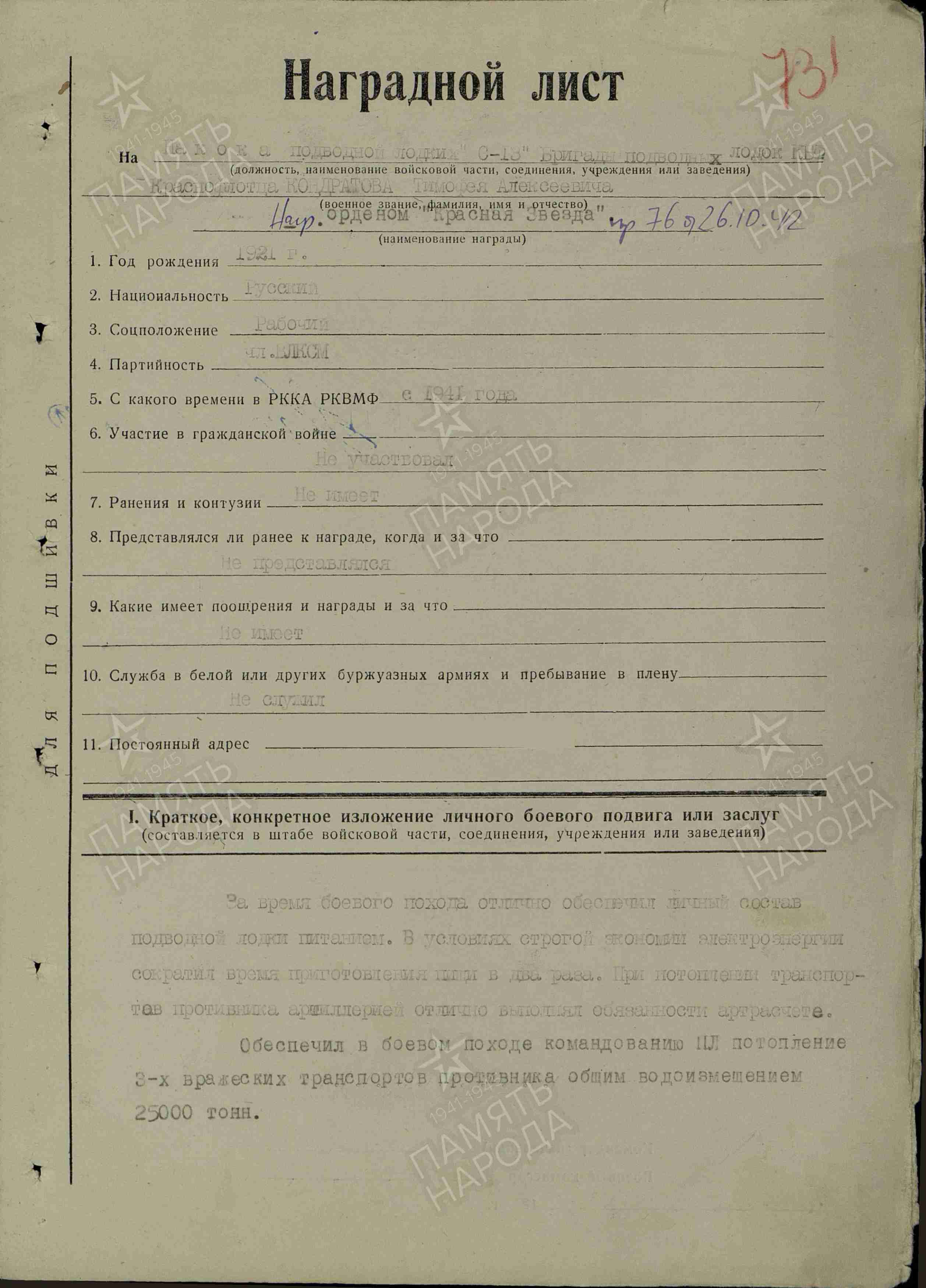 В боевом походе на подводной лодке 2 сентября 1942 года (ещё без А. Маринеско) бывший радист Тимофей Кондратов служил уже в качестве кока.