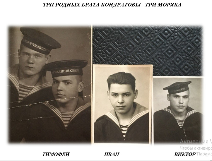 На одной из фотографий Тимофей Кондратов в бескозырке. На ней надпись: «морское училище связи». Можно предположить, что к лету 1941 года молодые призывники, отслужившие на кораблях меньше года, были ещё не готовы к условиям настоящей войны и поэтому их распределили на курсы при морских учебных заведениях. Там в экспресс-режиме доводили подготовку молодых моряков для нужд флота в условиях военного времени. Ленты на бескозырке с подобной надписью, как у Т.Кондратова, существовали, к примеру, в Военно-морском училище связи имени Орджоникидзе (в послевоенное время преобразовано в Военно-морской институт радиоэлектроники им. А.С. Попова).