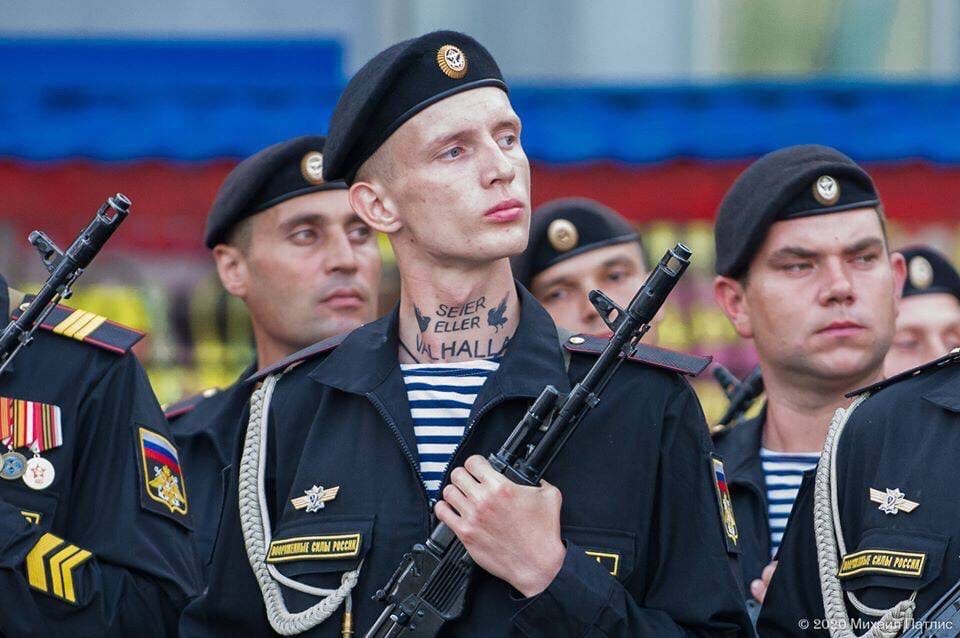 Во время репетиции Парада Победы в Симферополе фотокорреспондент Михаил Патлис сфотографировал морского пехотинца с татуировкой Seier eller valhalla (Победа или Вальхалла).