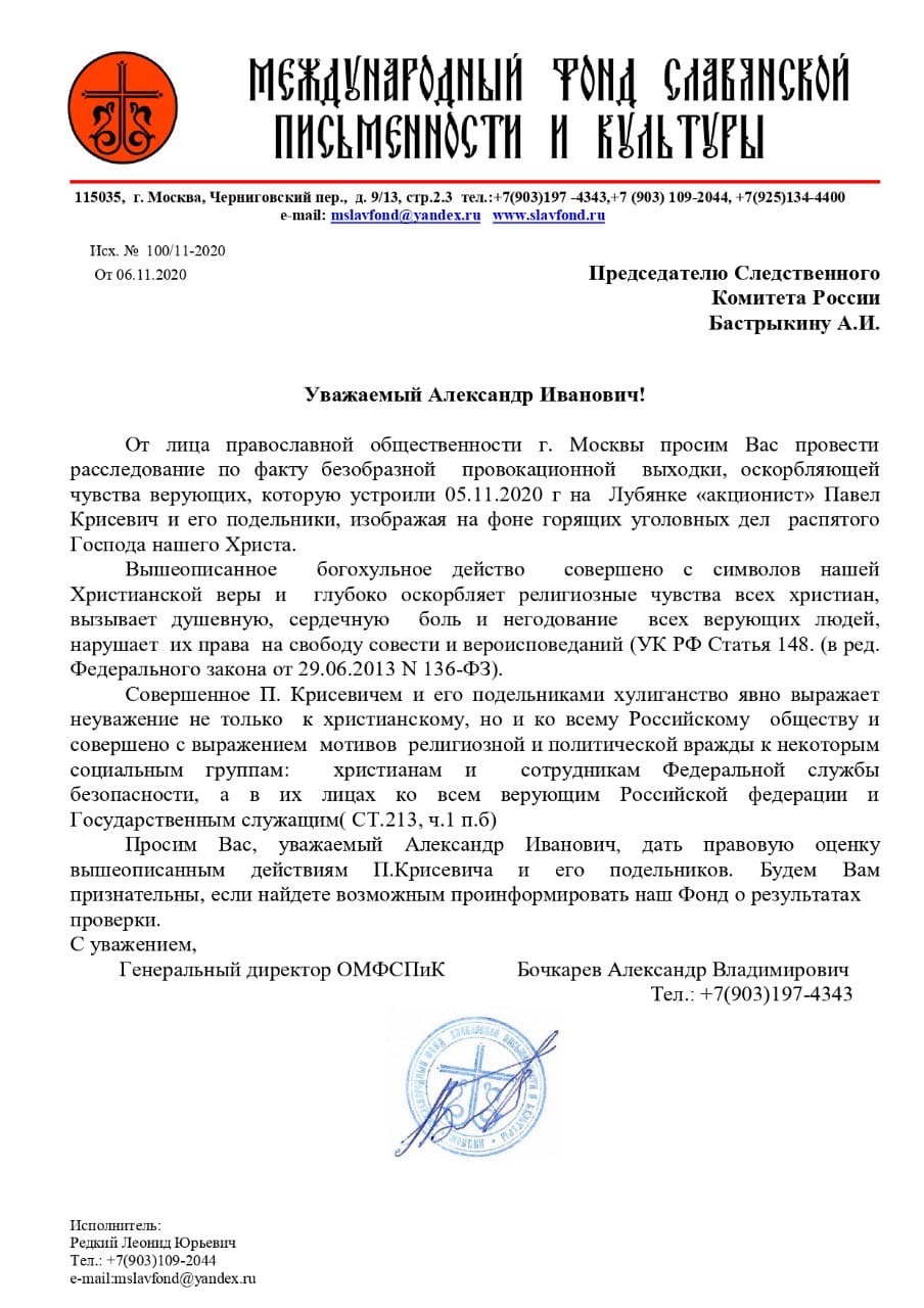 Генеральный директор Международного Фонда славянской письменности и культуры Александр Владимирович Бочкарёв от лица православной общественности обратился к начальнику ГУ МВД России по Москве генерал-лейтенанту полиции О.А.Баранову, председателю Следственного комитета России А.И.Бастрыкину, прокурору Москвы Д.Г.Попову с просьбой «провести расследование по факту безобразной провокационной выходки, оскорбляющей чувства верующих, которую устроили 5 ноября 2020 года на Лубянке "акционист" Павел Крисевич и его подельники, изображая на фоне горящих уголовных дел распятого Господа нашего Иисуса Христа».