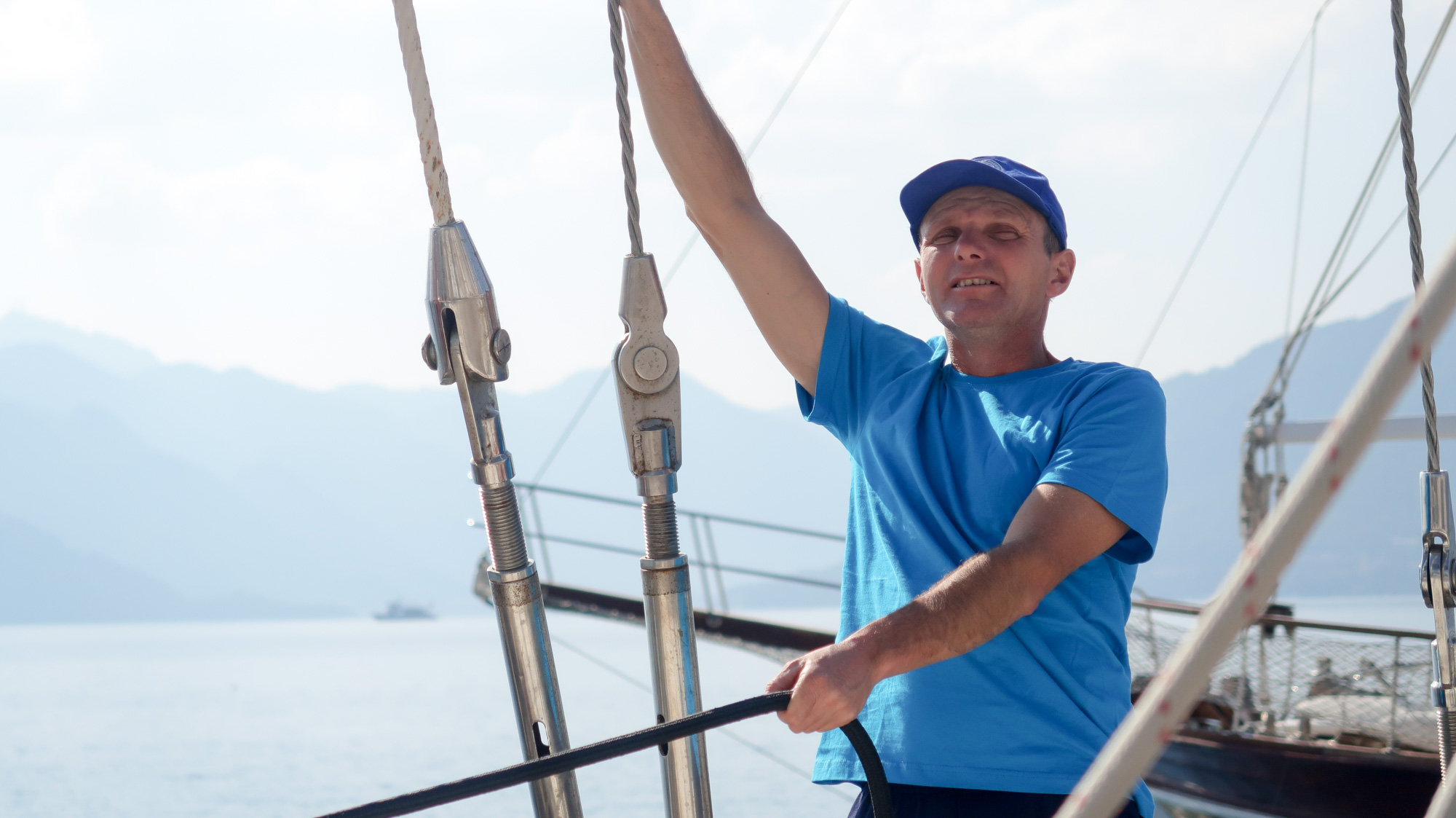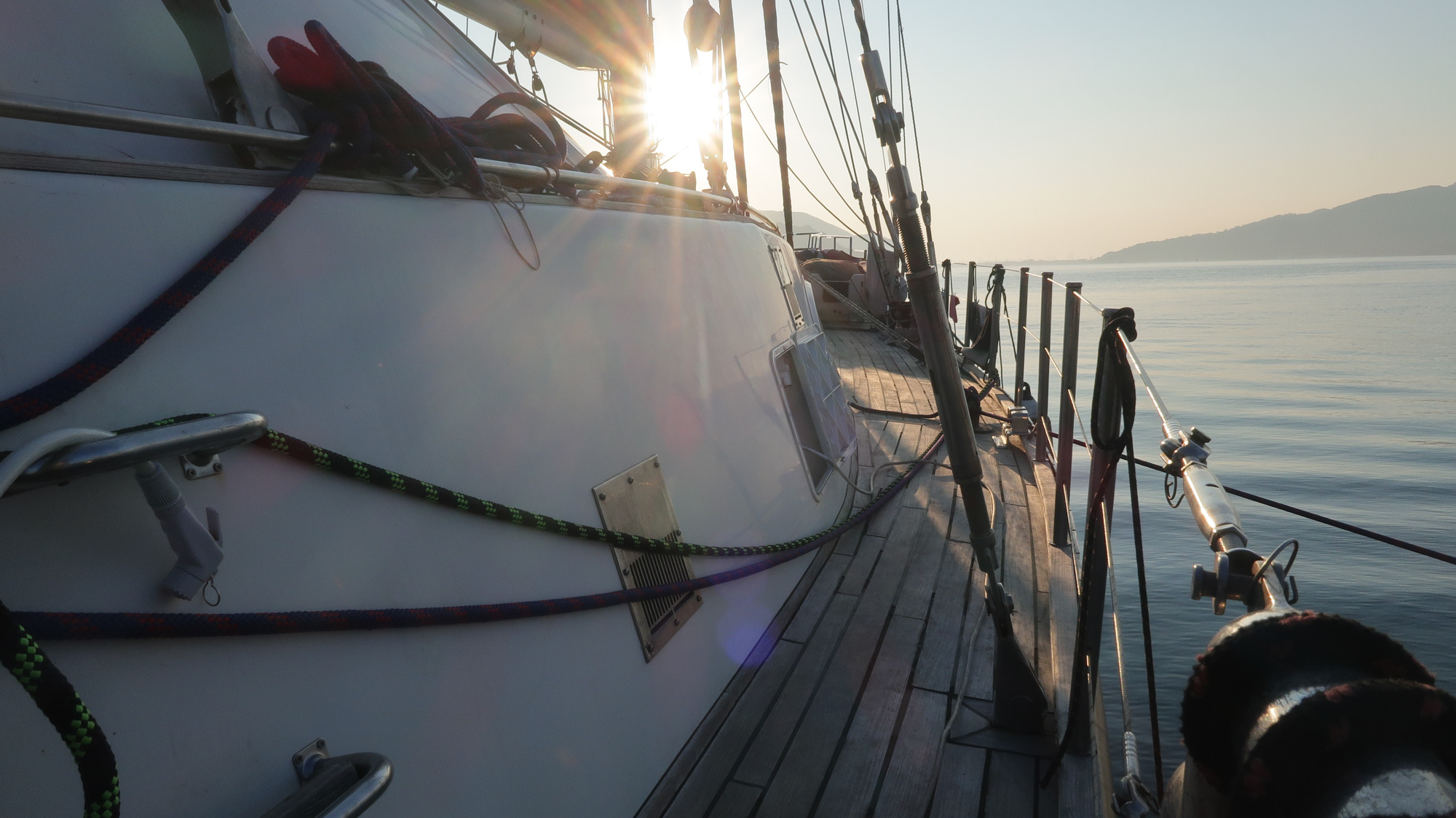 Погодная обстановка в Средиземном море не очень расположена к парусным плаваниям в сторону Гибралтара. Сильные встречные ветра заставили яхту идти галсами с зарифленными парусами. Выход из Эгейского в Ионическое море приветствовал экипаж сильным, 10-12 м/с западным ветром и зыбью высотой 3-3,5 метра. 7-го декабря сила ветра увеличилась до 14 метров, волна поднялась до 4-х метров. Двое суток экипаж упорно вел судно правым галсом к Африканским берегам, в надежде на исполнение прогноза погоды, обещавшего 8-9-го числа отход ветра на юго-западные направления, что позволило бы, сменив галс, выйти в пролив омывающий Сицилию. Прогноз запаздывал, и с 8-го декабря усиление западного ветра составило 15, на порывах 18 м/с. Продвижение вперед становилось все труднее. Судно испытывало резкую качку, удары носовой части о набегающие волны. Всё, что было закреплено внутри судна начало оживать и двигаться, периодически выпрыгивая из веревочных пут в свободный полет. Компановка яхты позволяет экипажу управлять судном, не выходя из навигационной рубки, однако палубные работы с концами и парусами предполагают пребывание на открытой палубе и тяжелый физический труд. Вдоль судна натянуты штормовые леера, экипаж перед выходом на парусные авралы снаряжается спасательными жилетами, страховочными поясами и пристегивается к штормовым леерам.