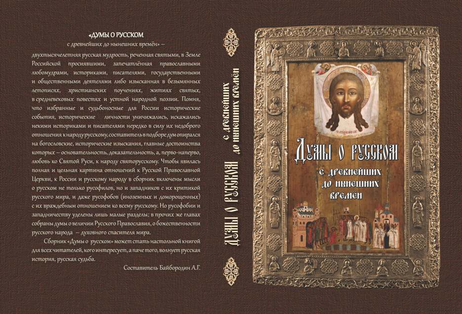 Неисповедимы пути творческие, неисповедимы были и пути рождения сего сборника цитат, в который вошли мысли и впечатления о русском: о православной вере, о народе, культуре, истории, этике, эстетике, идеологии и государстве Российском, изложенные святыми отцами Русской Правословной Церкви, богословами, писателями, учеными, государственными, общественными и культурными деятелями, а так же цитаты из русских летописей, фольклорных сборников и святоотеческих православных источников. Четверть века исподволь собирались «амбарные книги» цитат – запечатленных высказываний о русском, кои составитель, даже и не помышляя о подобном сборнике, выписывал либо для университетских лекций, либо для цитирования в очерках и статьях, а то и, просто, поразившись мудрой и украсной силой высказываний. В некое время стало жалко, что так и сгинут в амбарных книгах мысли о русском, реченные святыми, несвятыми, славянофилами, русофилами, почвенниками, до самоотречения любящими всё русское, но и сказанные русью и нерусью, презирающими, и порой и ненавидящами всё русское. Хотелось, чтобы «думы о русском» стали ведомы многим русским, кои не сподобятся перечитать уйму литературы, где рассеяны «думы». И лет десять назад, на основе выписок стал целенаправленно готовить сборник, который и повеличал – «ДУМЫ О РУССКОМ с древнейших до нынешних времен». Разумеется, для наполнения и окончательного формирования разделов книги пристально, с выписками, читал православные канонические тексты, жития святых, в Земле Россиской просиявших, пророчества и величания святых, и, наконец, десятки очерков и статей, где осмыслялась русская история, русская судьба.