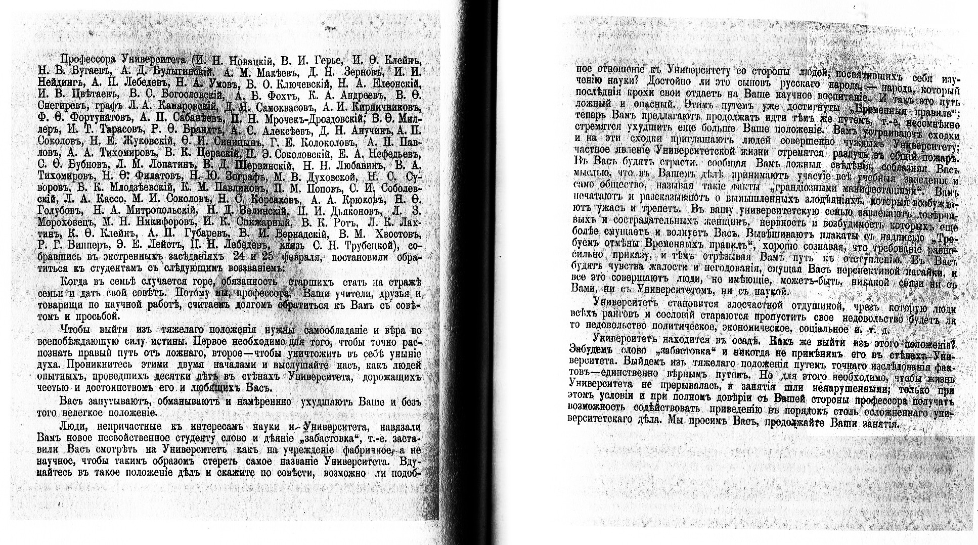 «Профессора Университета (И.Н. Новацкий, В.И. Герье, И.Ф. Клейн, Н.В. Бугаев, А.Д. Булыгинский, А.М. Макеев, Д.Н. Зернов, И.И. Нейдинг, А.П. Лебедев, Н.А. Умов, В.О. Ключевский, Н.А. Елеонский, И.В. Цветаев, В.С. Богословский, А.Б. Фохт, К.А. Андреев, В.Ф. Снегирёв, граф Л.А. Камаровский, Д.Я. Самоквасов, А.И. Кирпичников, Ф.Ф. Фортунатов, А.П. Сабанеев, П.Н. Мрочек-Дроздовский, В.Ф. Миллер, И.Т. Тарасов, Р.Ф. Брандт, А.С. Алексеев, Д.Н. Анучин, А.П. Соколов, Н.Е. Жуковский, Ф.И. Синицын, Г.Е. Колоколов, А.П. Павлов, А.А. Тихомиров, В.К. Цераский, П.Э. Соколовский, Е.А. Нефедьев С.Ф. Бубнов, Л.М. Лопатин, В.Д. Шервинский, Н.Н. Любавин,В.А. Тихомиров, Н.Ф. Филатов, Н.Ю. Зограф, М.В. Духовской, Н.С. Суворов, Б.К. Млодзеевский, К.М. Павлинов, П.М. Попов, С.И. Соболевский, Л.А. Кассо, М.И. Соколов, Н.С. Корсаков, А.А. Крюков, Н.Ф. Голубов, Н.А. Митропольский, Н.Д. Зелинский, П.И. Дьяконов, Л.3. Мороховец, М.Н. Никифоров, И.К. Спижарный, В.К. Рот, Л.К. Лахтин, К.Ф. Клейн, А.П. Губарев, В.И. Вернадский, В.М. Хвостов, Р.Г. Виппер, Э.Е. Лейст, П.Н. Лебедев, кн. С.Н. Трубецкой), собравшись в экстренных заседаниях 24 и 25 февраля, постановили обратиться к студентам со следующим воззванием: