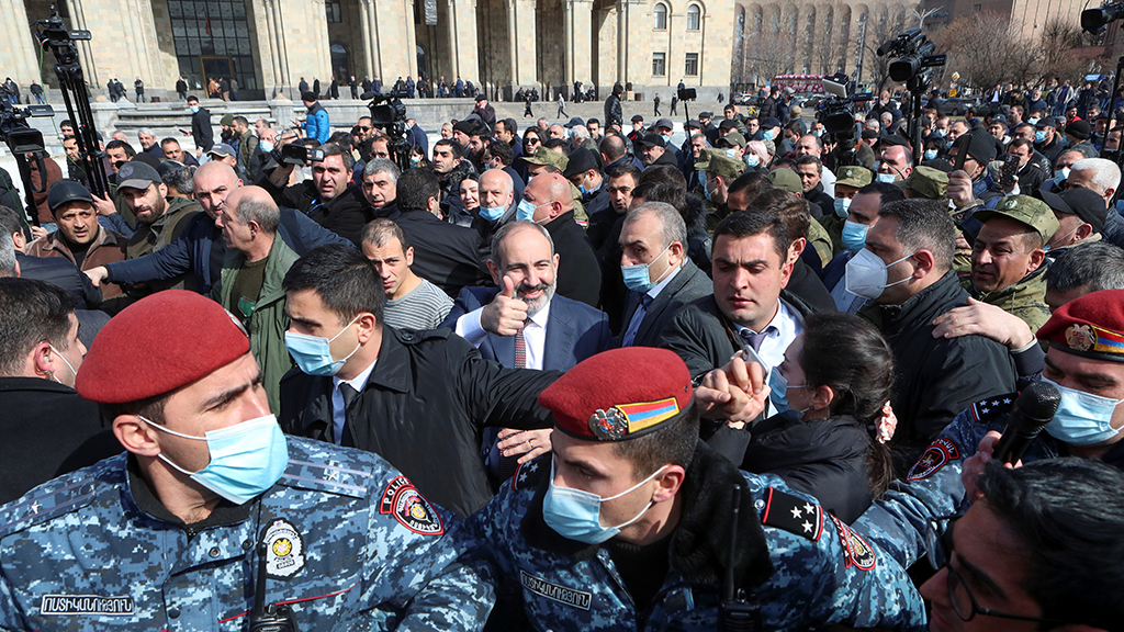 Оппозиция требует отставки Пашиняна с ноября, после того как он подписал соглашение с Азербайджаном о прекращении огня в Нагорном Карабахе. В соответствии с этим документом Армения передала Азербайджану Кельбаджарский, Лачинский и Агдамский районы, а вдоль линии соприкосновения и в Лачинском коридоре разместились российские миротворцы. В Баку соглашение назвали капитуляцией Еревана, а Пашинян признавался, что решение о мире далось ему тяжело, но позволило сохранить то, что Карабах бы потерял