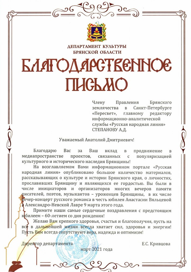 Александр Павлович Цыбульский, член Правления МОО Брянское землячество в Санкт-Петербурге и Ленобласти «Пересвет»: «Дорогой мой друг, земляк и единомышленник Анатолий Дмитриевич! Прими мои самые искренние поздравления с ЮБИЛЕЕМ! Богатырского тебе здоровья, бодрости духа, крепкой веры ПРАВОСЛАВНОЙ, РЕАЛИЗАЦИИ всех планов и ЗАДУМОК! Мир твоему дому! Остальное скажу при встрече. ОБНИМАЮ!».
