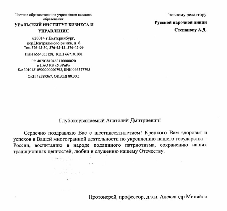 Тамара Николаевна Юдина, д.э.н., доцент МГУ имени М.В. Ломоносова, член-корр. РАЕН, член Центрального Правления Общества Российско-Китайской дружбы (ОРКД): «Анатолий Дмитриевич! С днем рождения!!! Желаю ВЕРЫ, НАДЕЖДЫ, ЛЮБВИ и СОФИИ, верного служения Богу, Царю и Отечеству, а также радости, мира, достатка. С Богом! С уважением, Юдина Т.Н.».