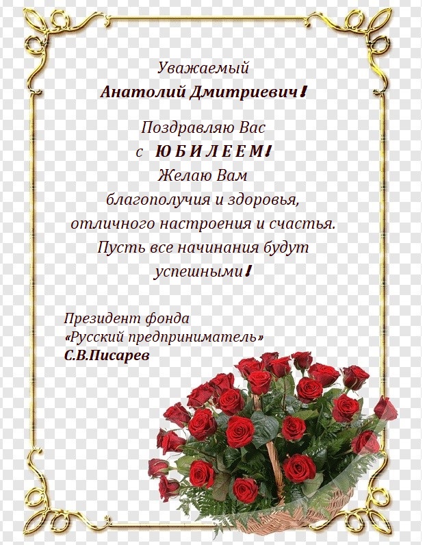 Василий Вадимович Бойко-Великий, председатель Русского Просветительского Фонда имени Святого Василия Великого: «Уважаемый Анатолий Дмитриевич! Поздравляю Вас с 60-летним юбилеем! С датой важной, особенной, значимой! Пусть Ваша мудрость, опыт и знания найдут своих поклонников и последователей! Здоровья крепкого, мобильности и бодрости! Желаю дальнейшего процветания, новых побед, интересных дел и встреч. С уважением, Василий Бойко-Великий».