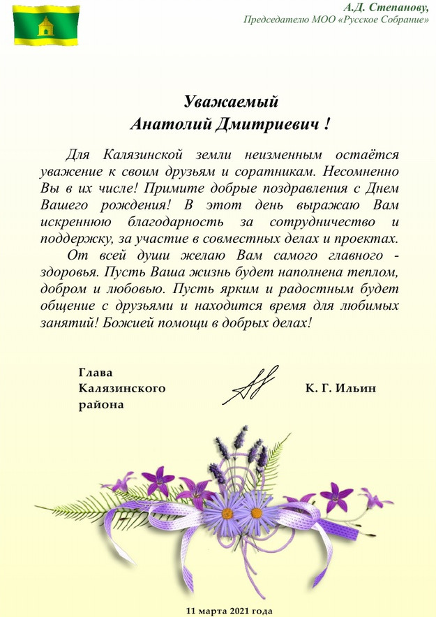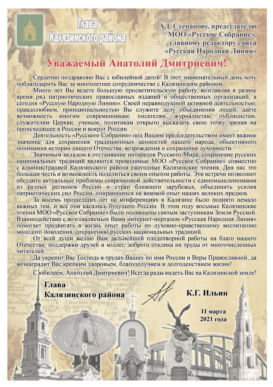 Глава администрации Калязинского района и член Центрального совета Международной общественной организации «Русское Собрание» Константин Геннадьевич Ильин поздравил главного редактора «Русской народной линии», председателя «Русского Собрания», члена Союза писателей России Анатолия Дмитриевича Степанова с 60-летием.