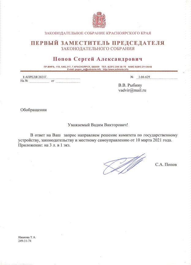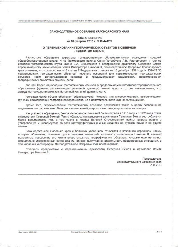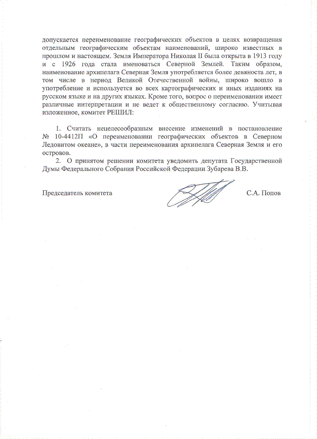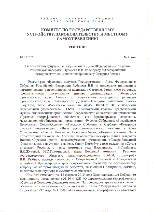 Наш автор публицист и переводчик, капитан 2-го ранга в отставке Вадим Викторович Рыбин переслал мне официальный ответ от Законодательного Собрания Красноярского края от 8 апреля на свой запрос. Оказывается, еще 10 марта Комитет по государственному устройству, законодательству и местному самоуправлению краевого ЗакСа принял решение «Об обращении депутата ГД ФС РФ Зубарева В.В. по вопросу "О возвращении исторического наименования архипелагу Северная Земля"».