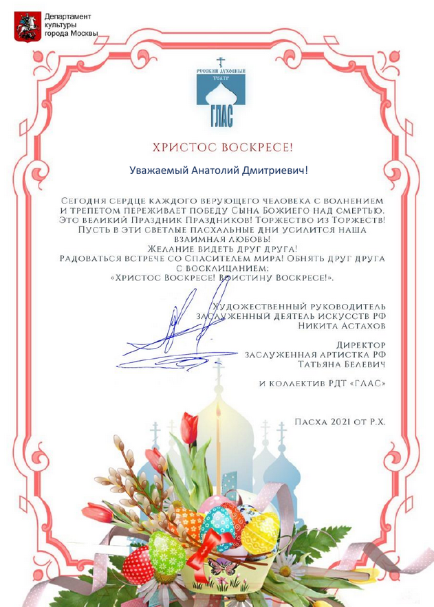 «Досточтимый Анатолий Дмитриевич! От лица преподавателей, сотрудников и студентов Православного Свято-Тихоновского Гуманитарного Университета сердечно поздравляю Вас с праздником светлого Христова Воскресения!
