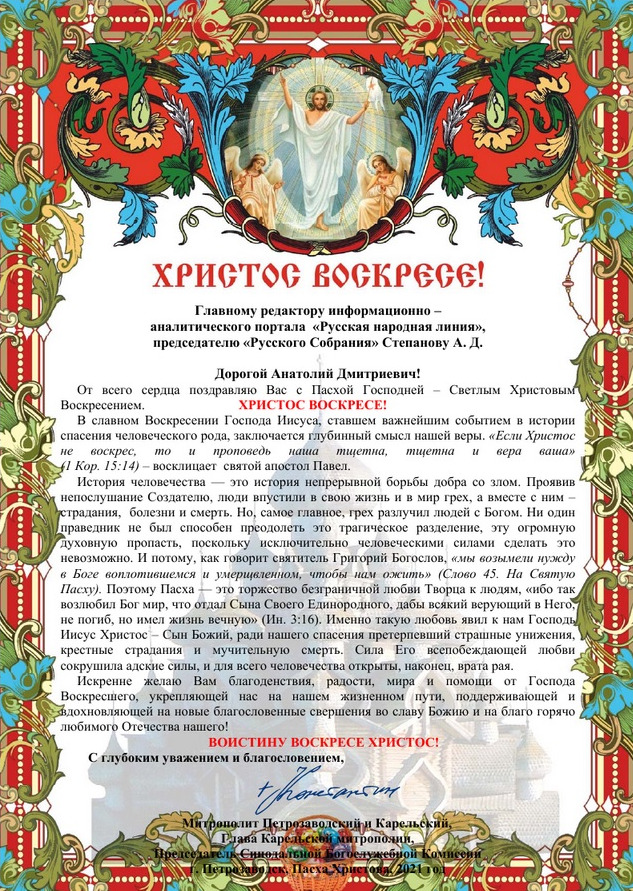 «Дорогой Анатолий Дмитриевич! Сердечно поздравляем с торжествами Воскресения Иисуса Христа и с приближающимся Днём Победы! Желаем вам тихой радости, мирного духа, терпения и всесильной помощи Господа во всех трудах и Многая и благая лета!